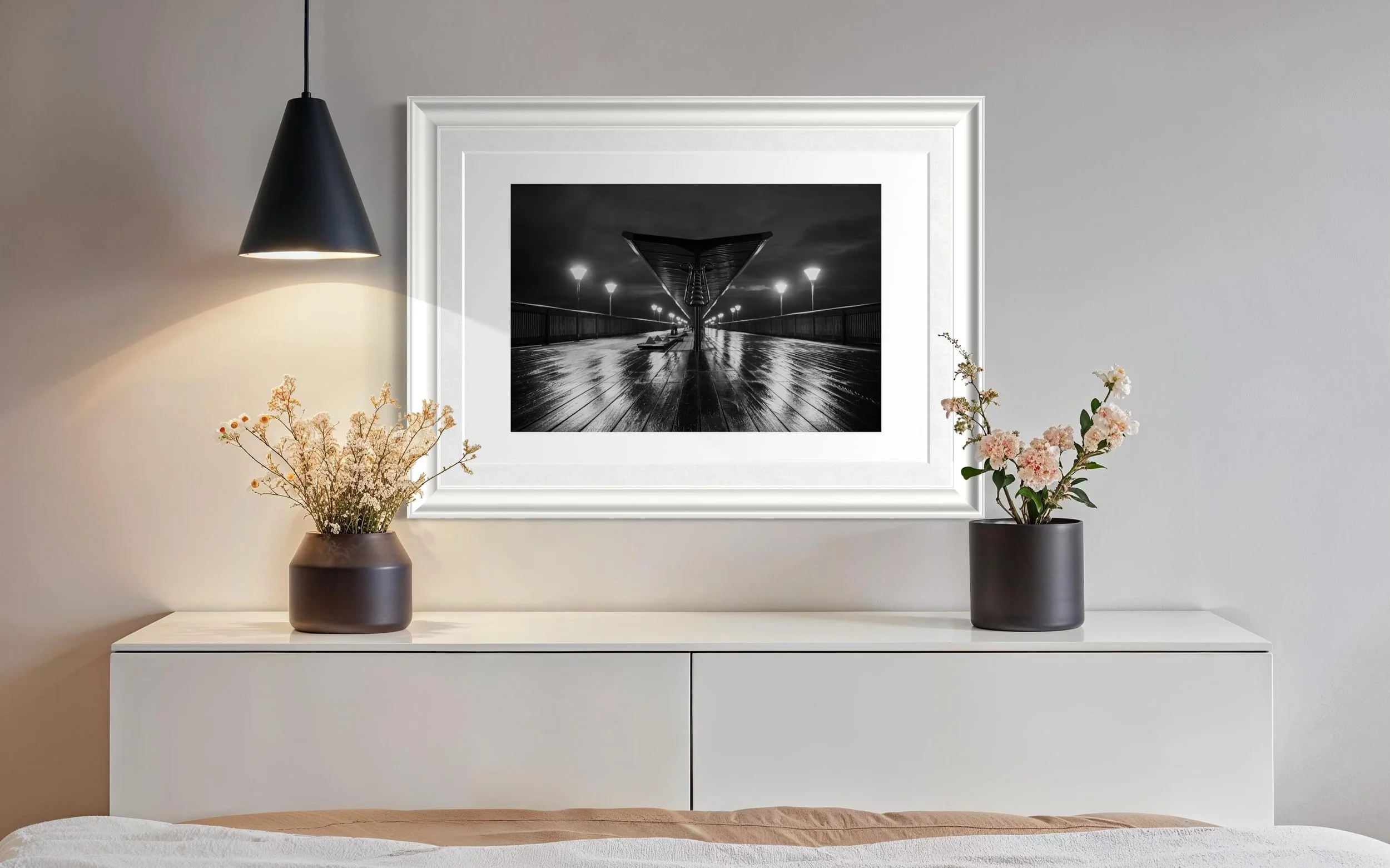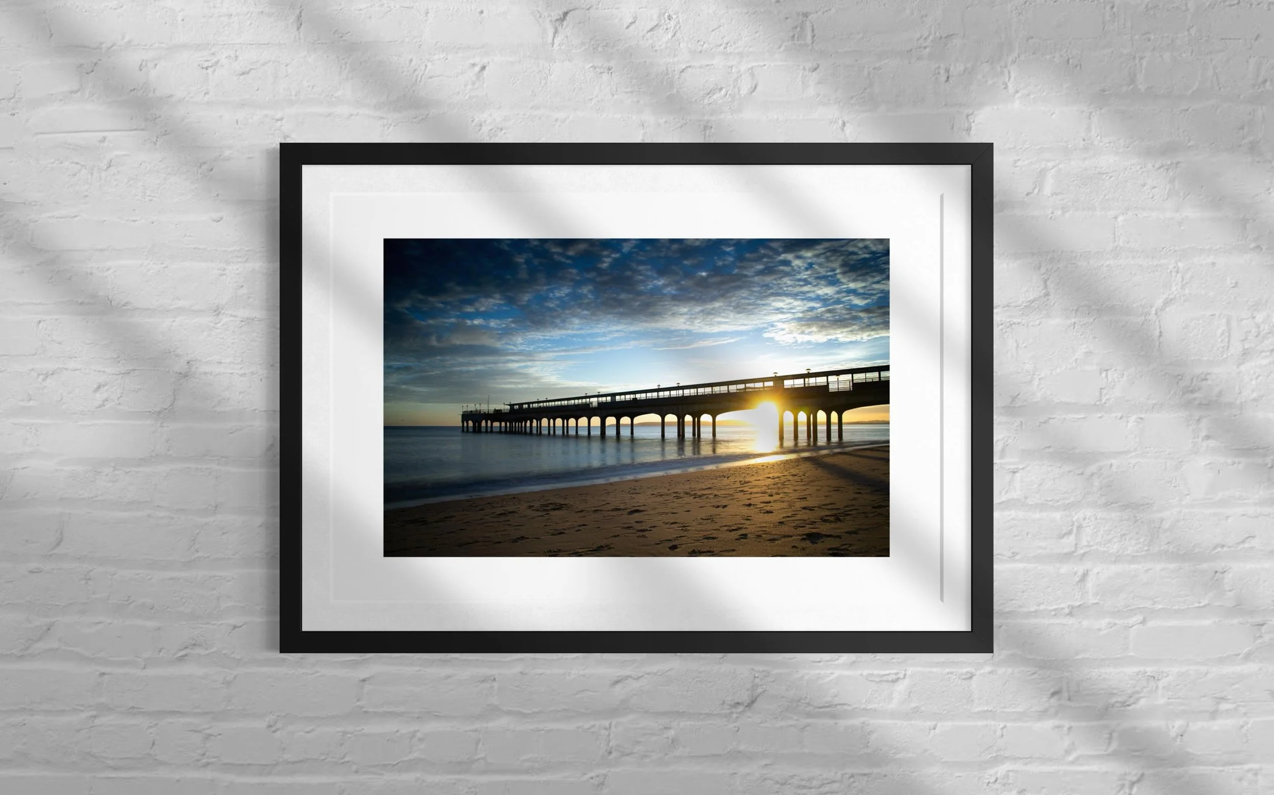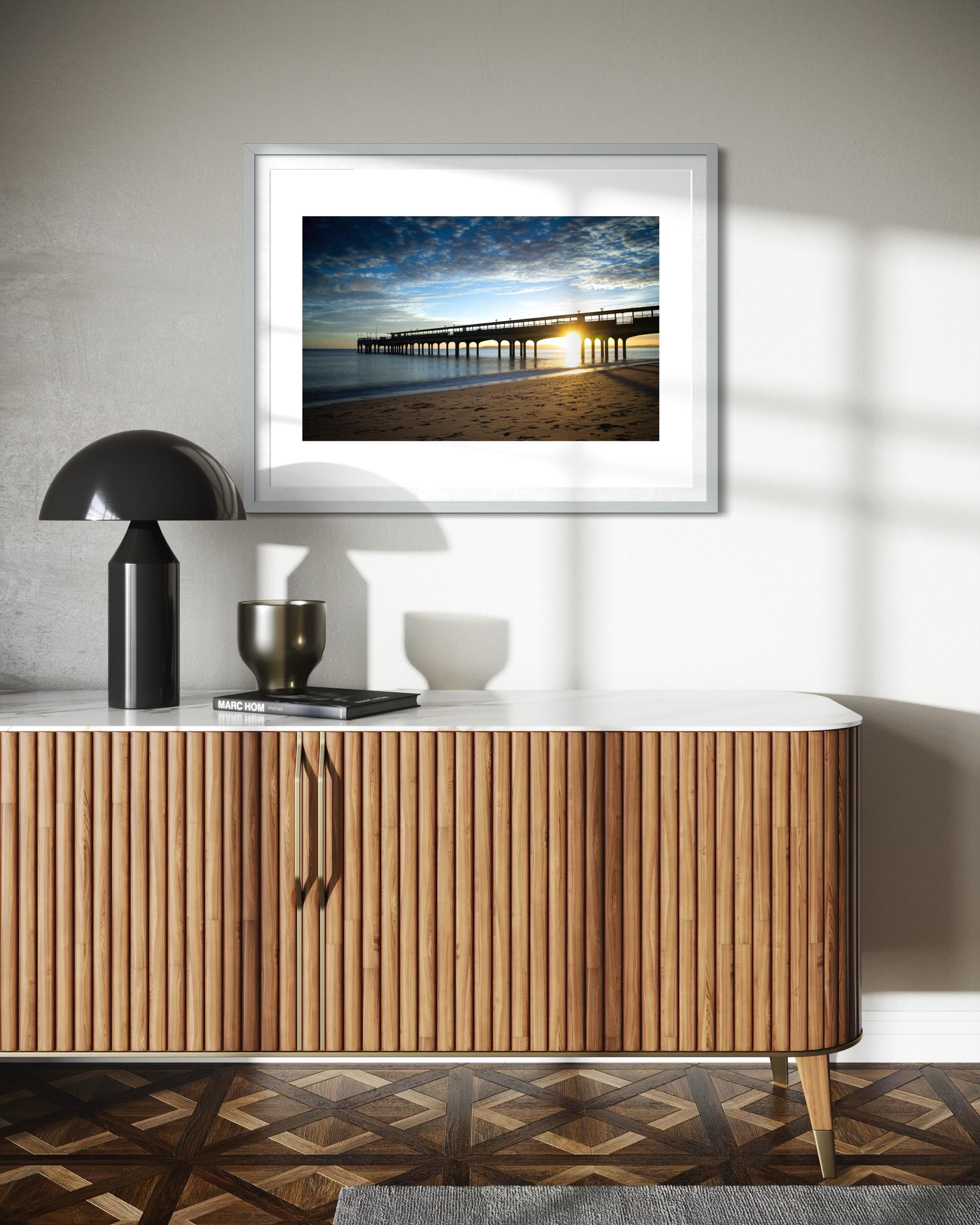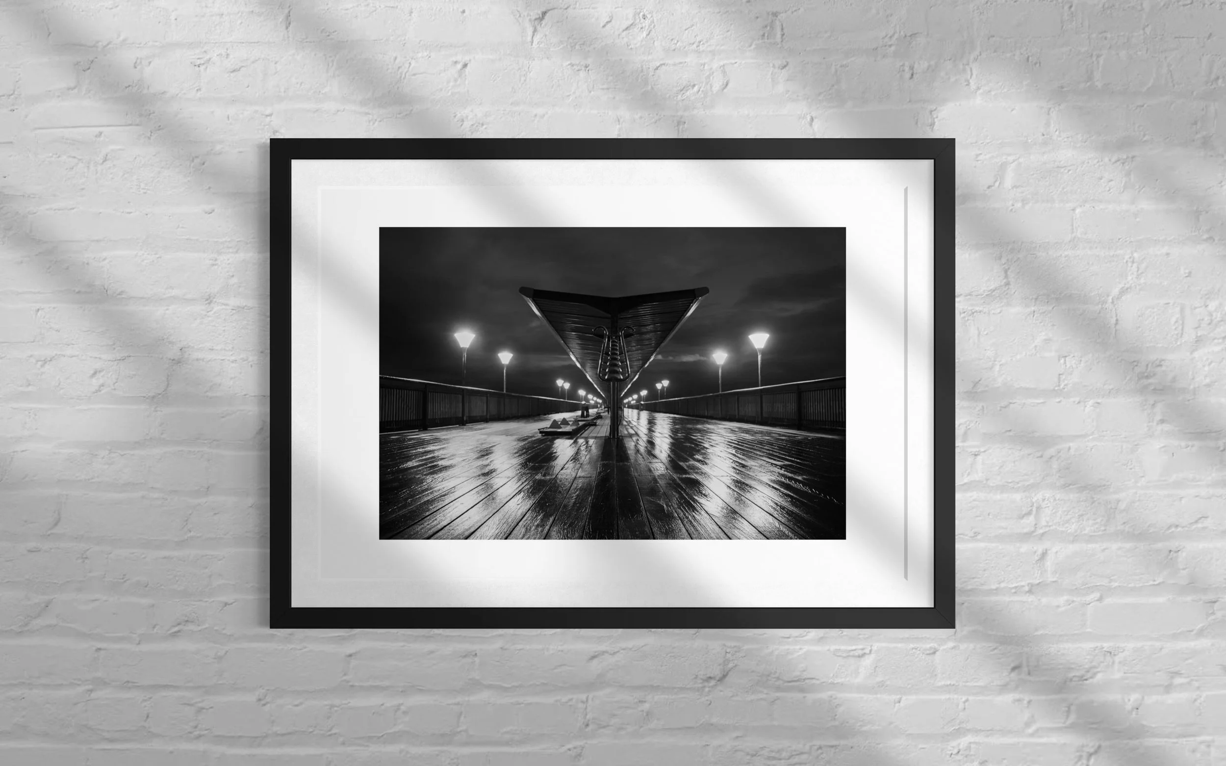 This stunning black and white print captures Boscombe Pier after a rainstorm. The reflection of the lights in the water still sitting on the boardwalk extenuates the wood giving a textural feel to the picture.