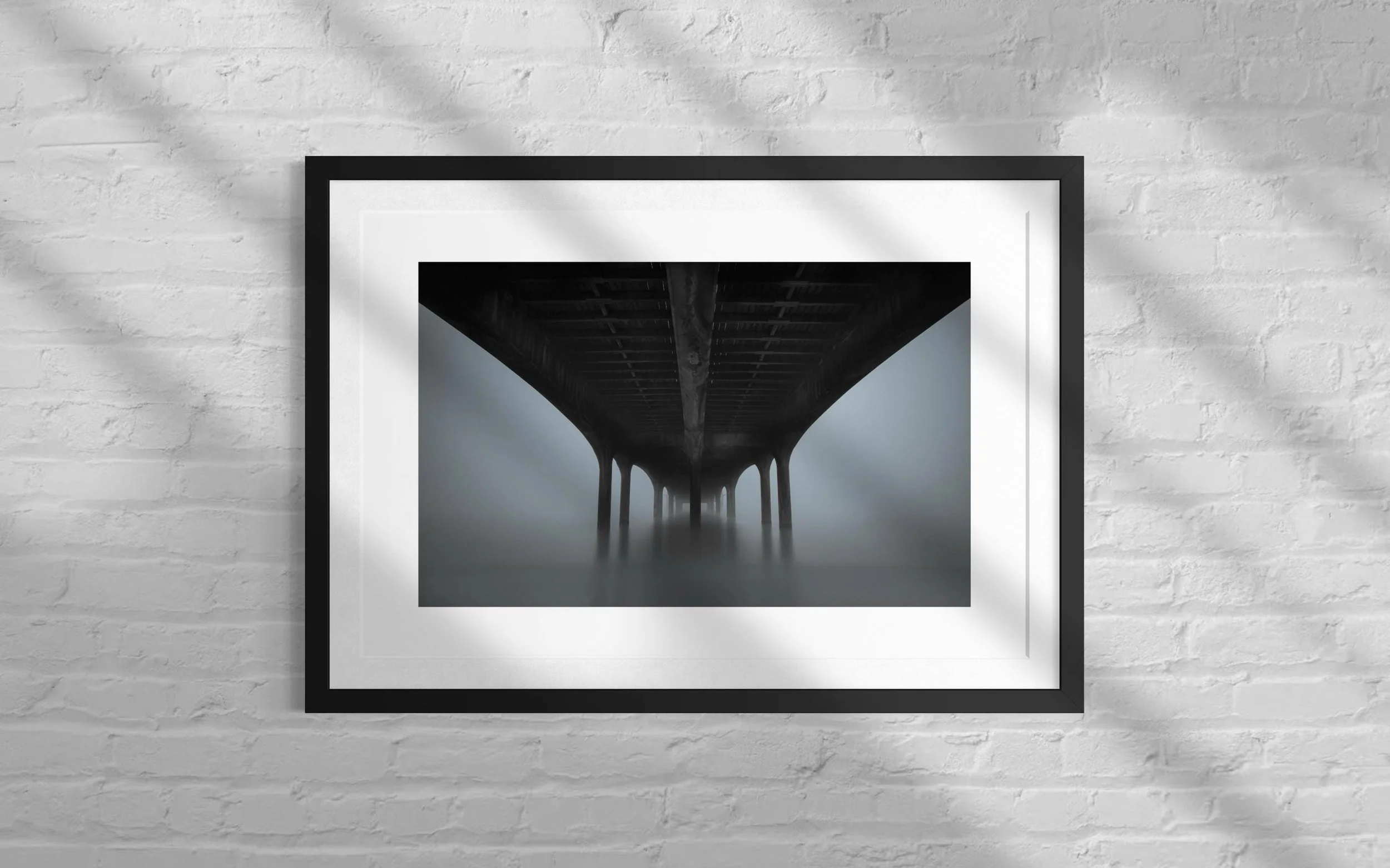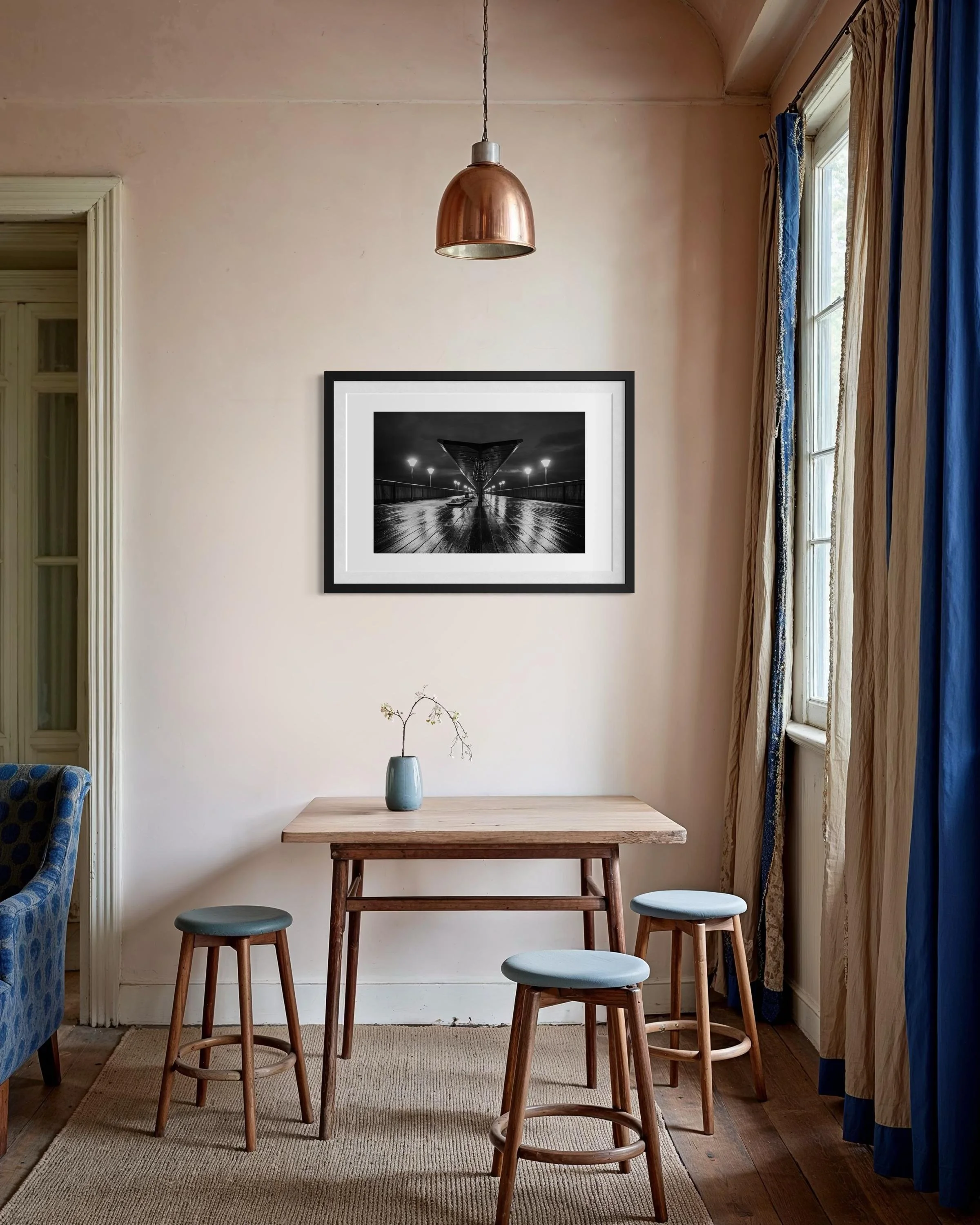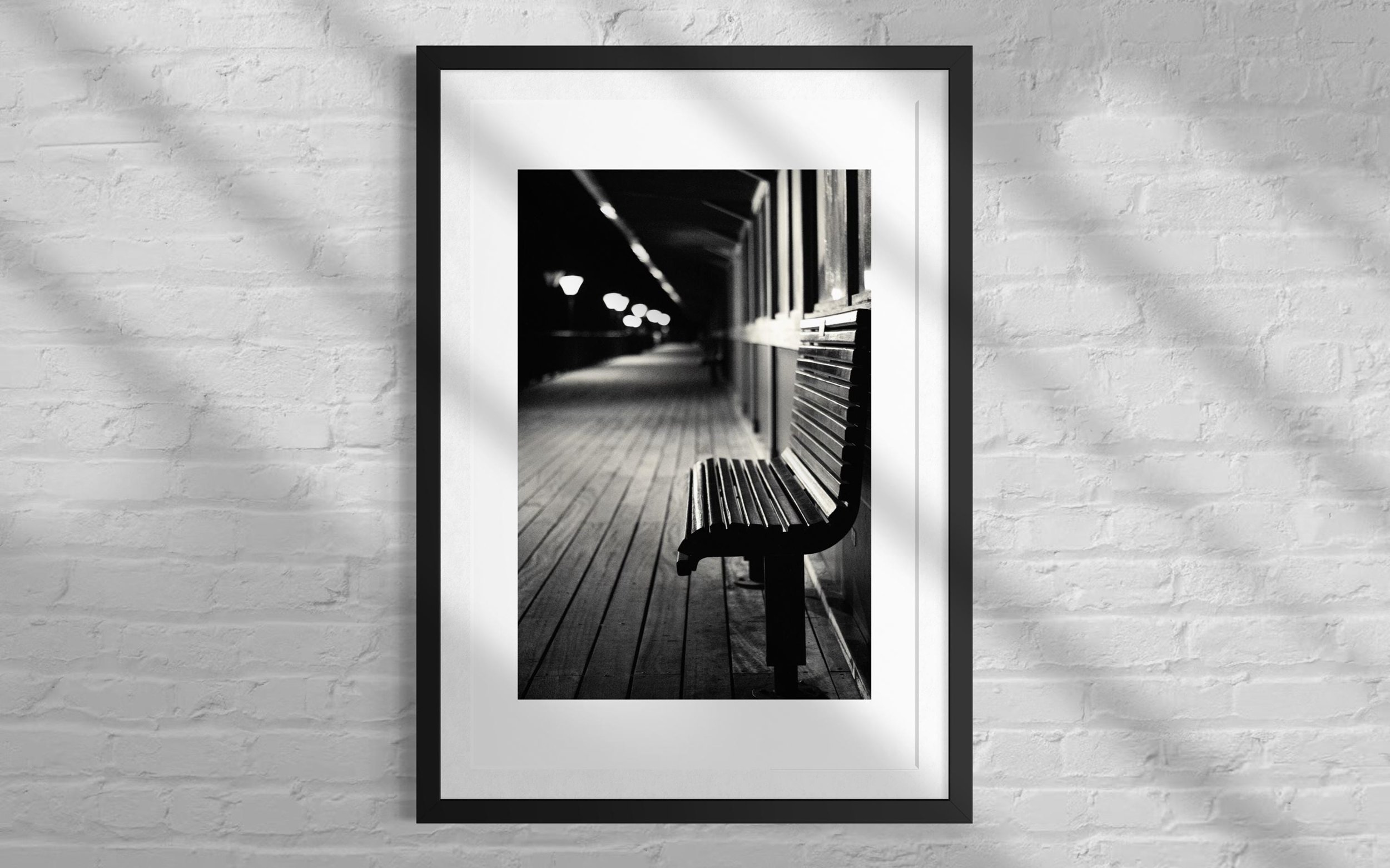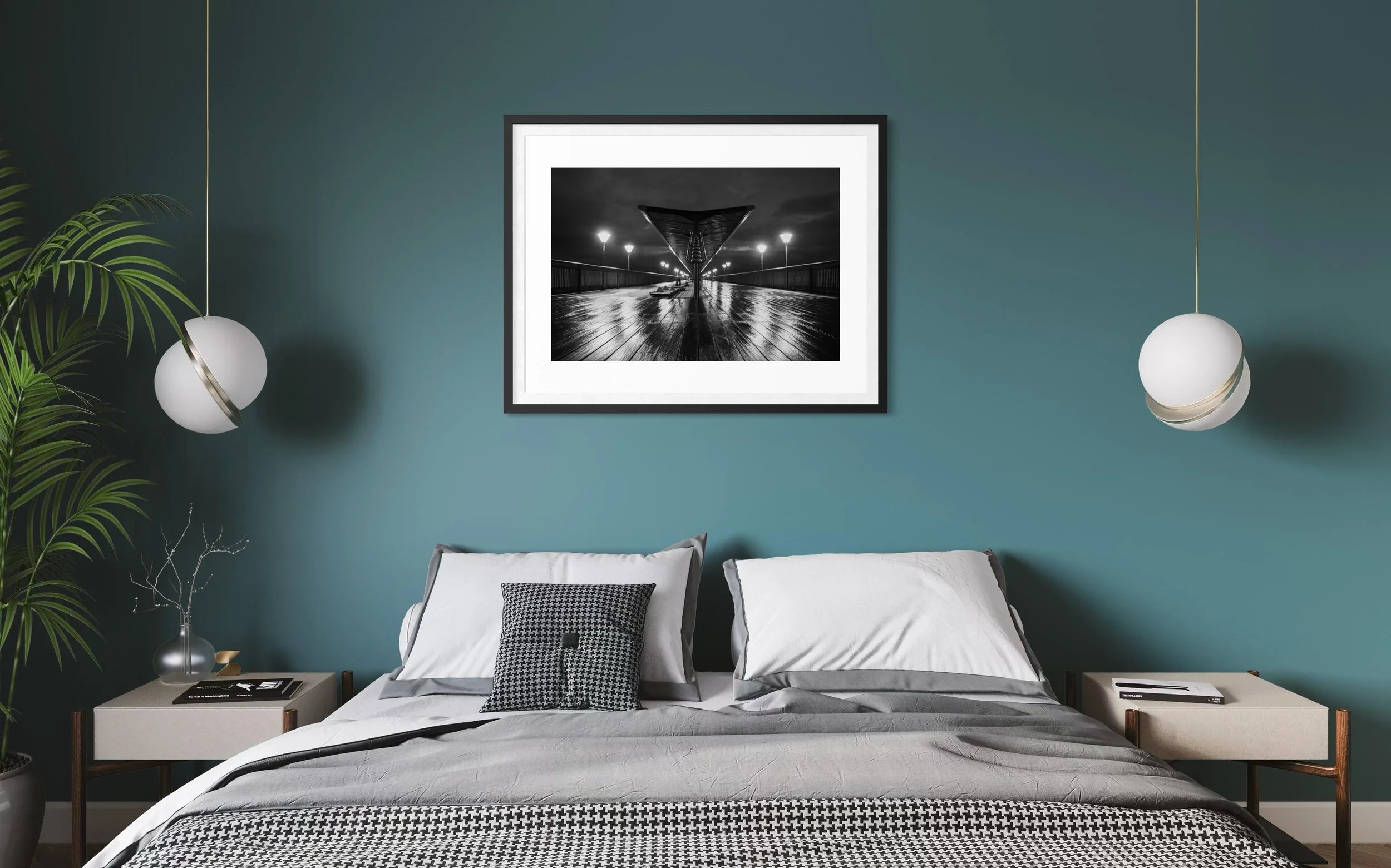 This stunning black and white print captures Boscombe Pier after a rainstorm. The reflection of the lights in the water still sitting on the boardwalk extenuates the wood giving a textural feel to the picture.