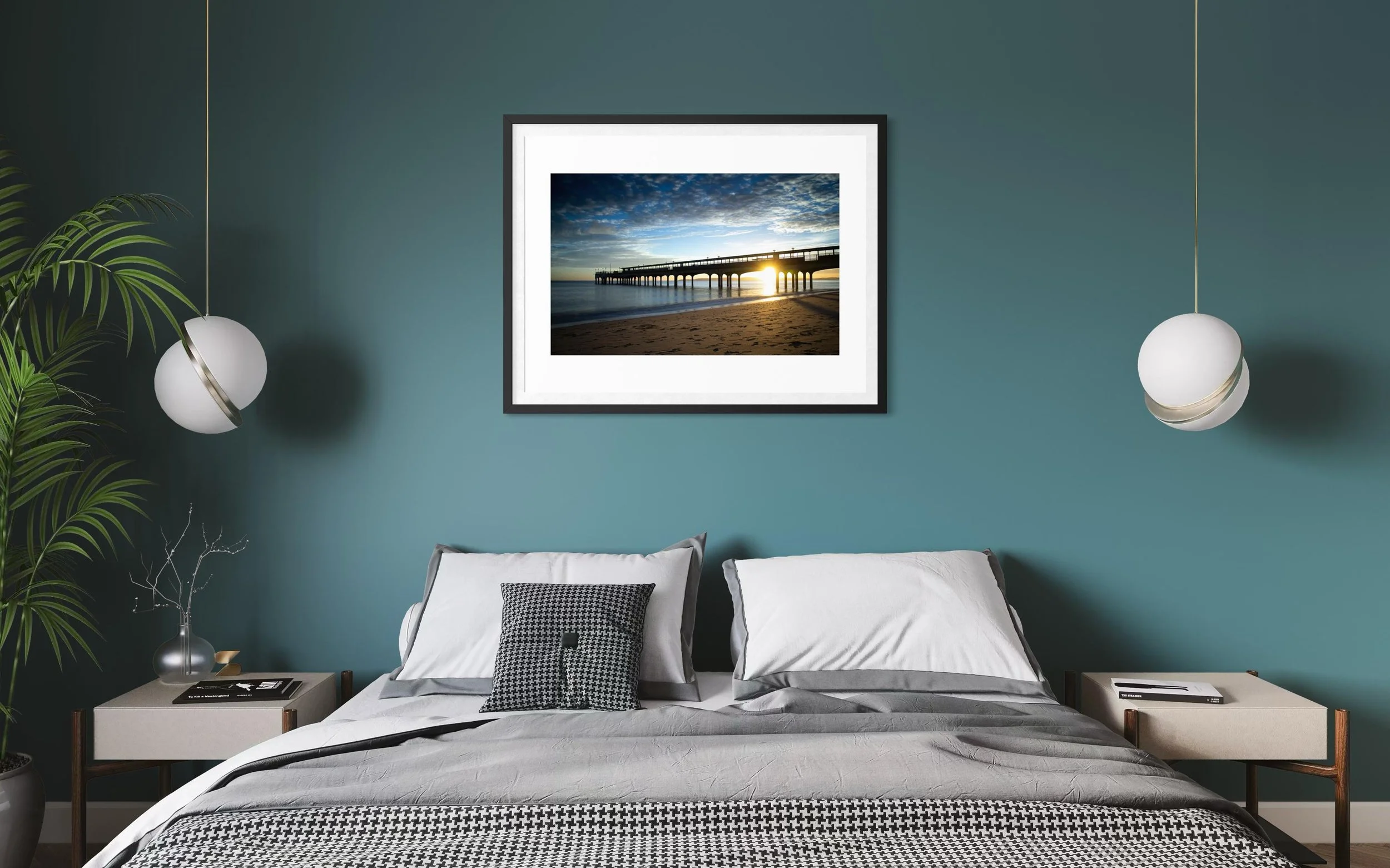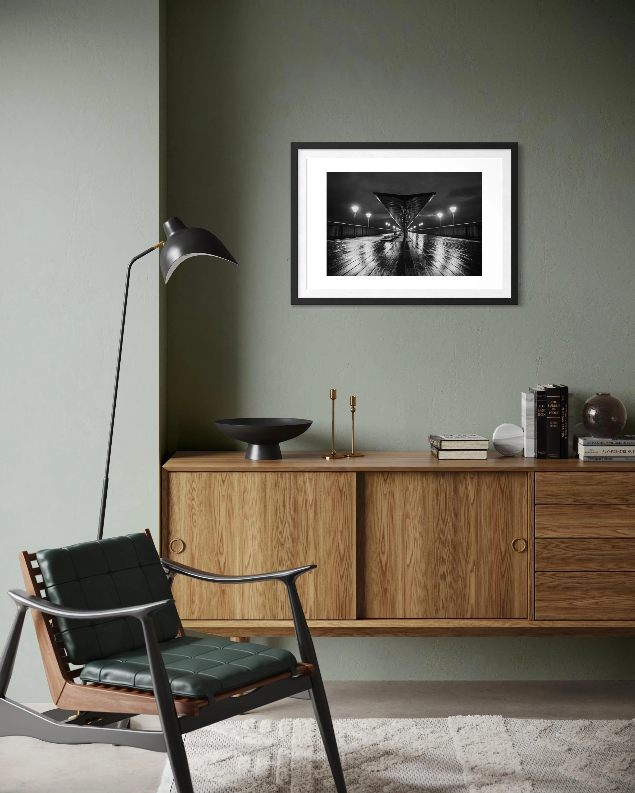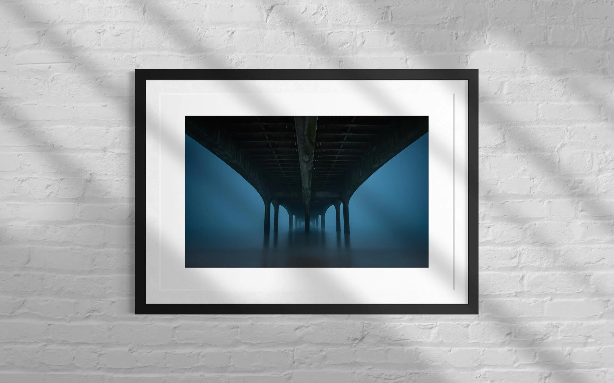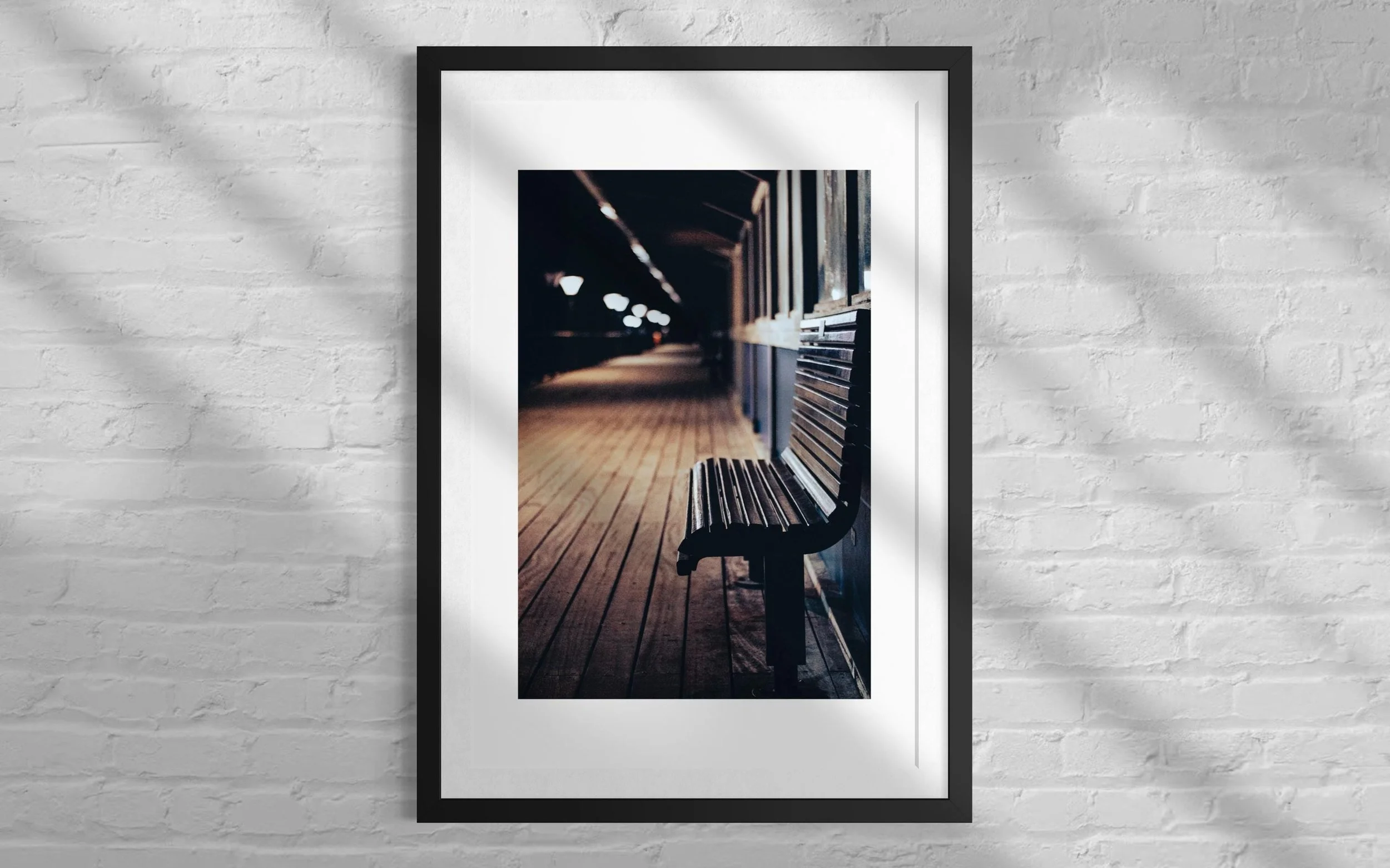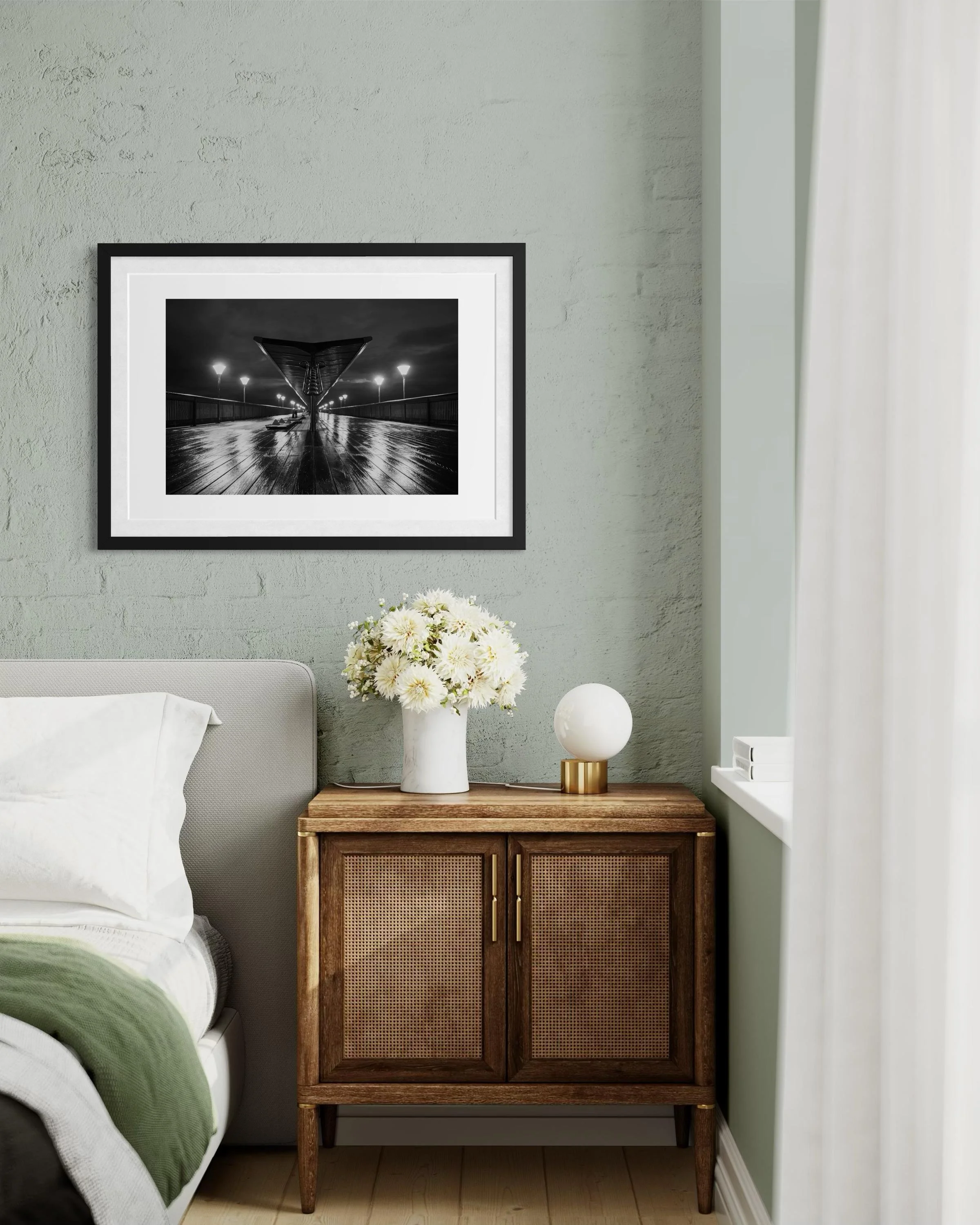 This stunning black and white print captures Boscombe Pier after a rainstorm. The reflection of the lights in the water still sitting on the boardwalk extenuates the wood giving a textural feel to the picture.