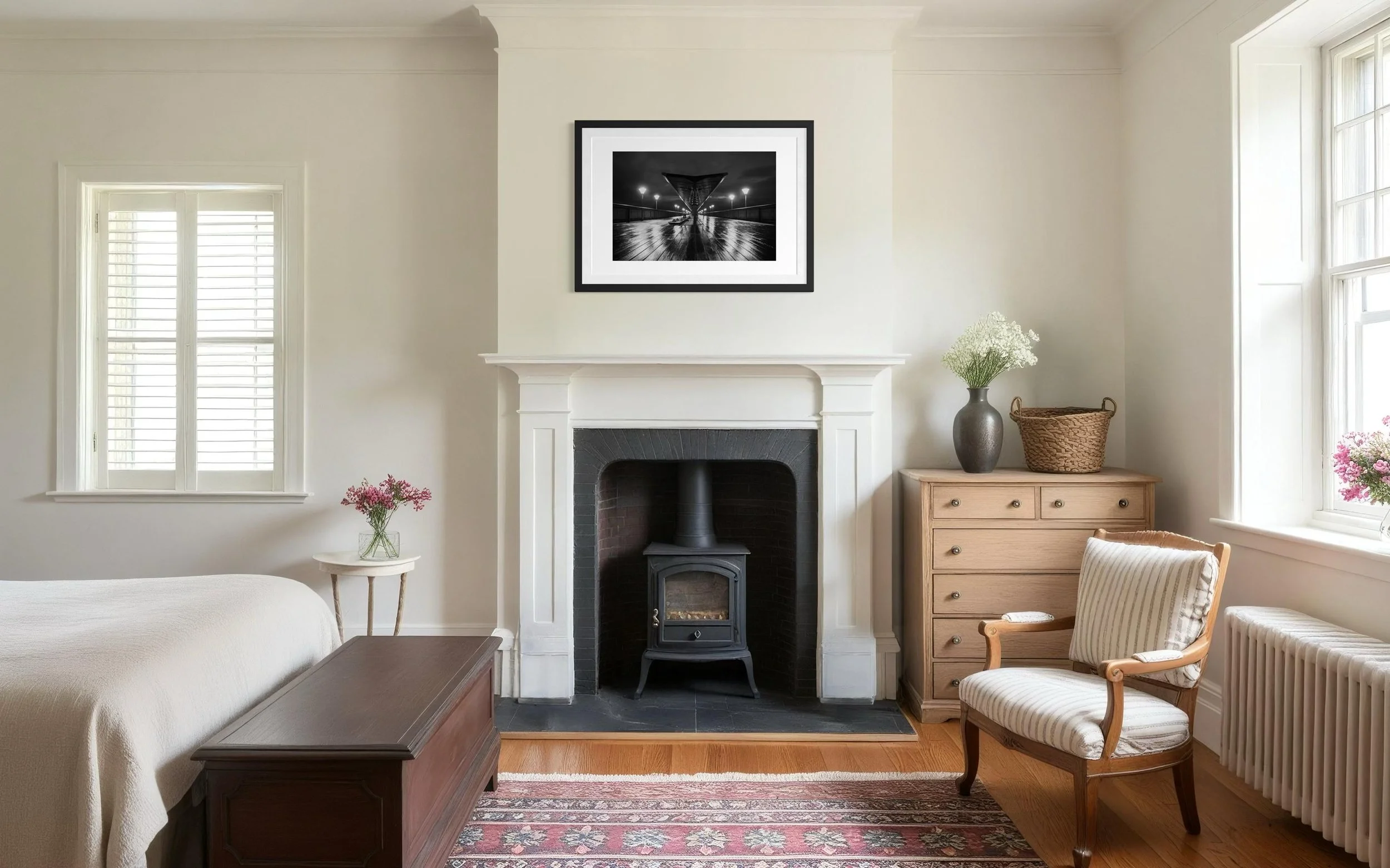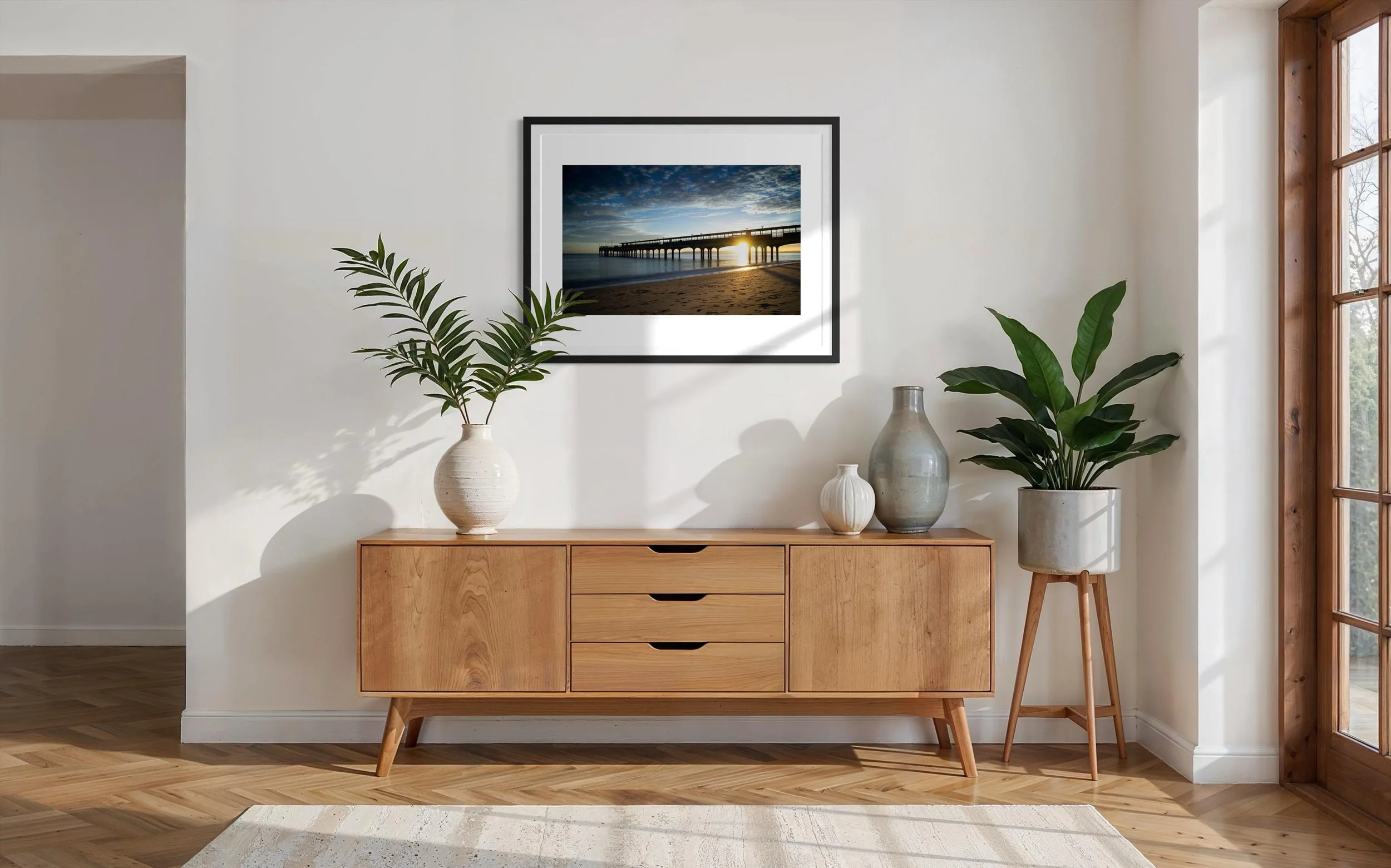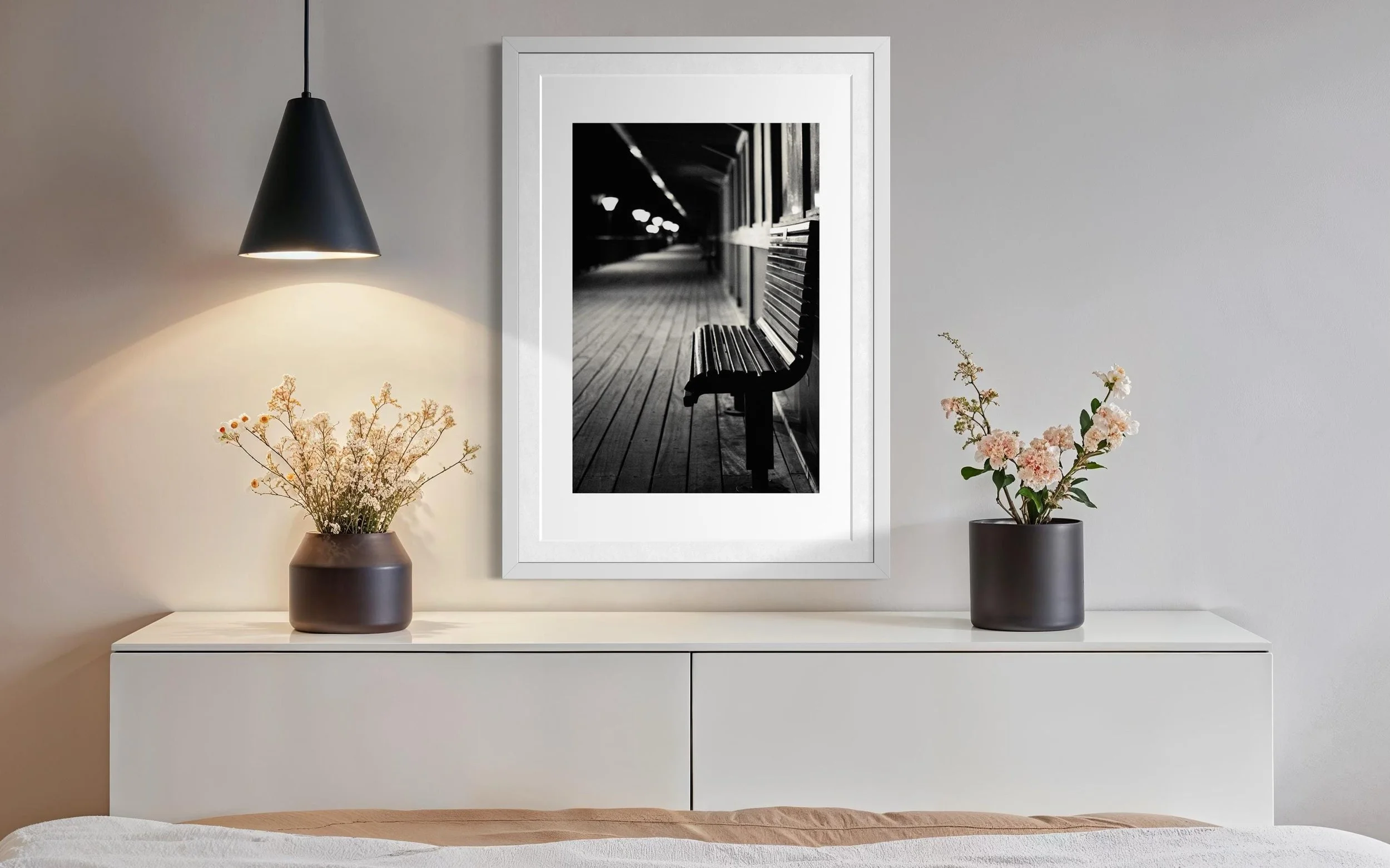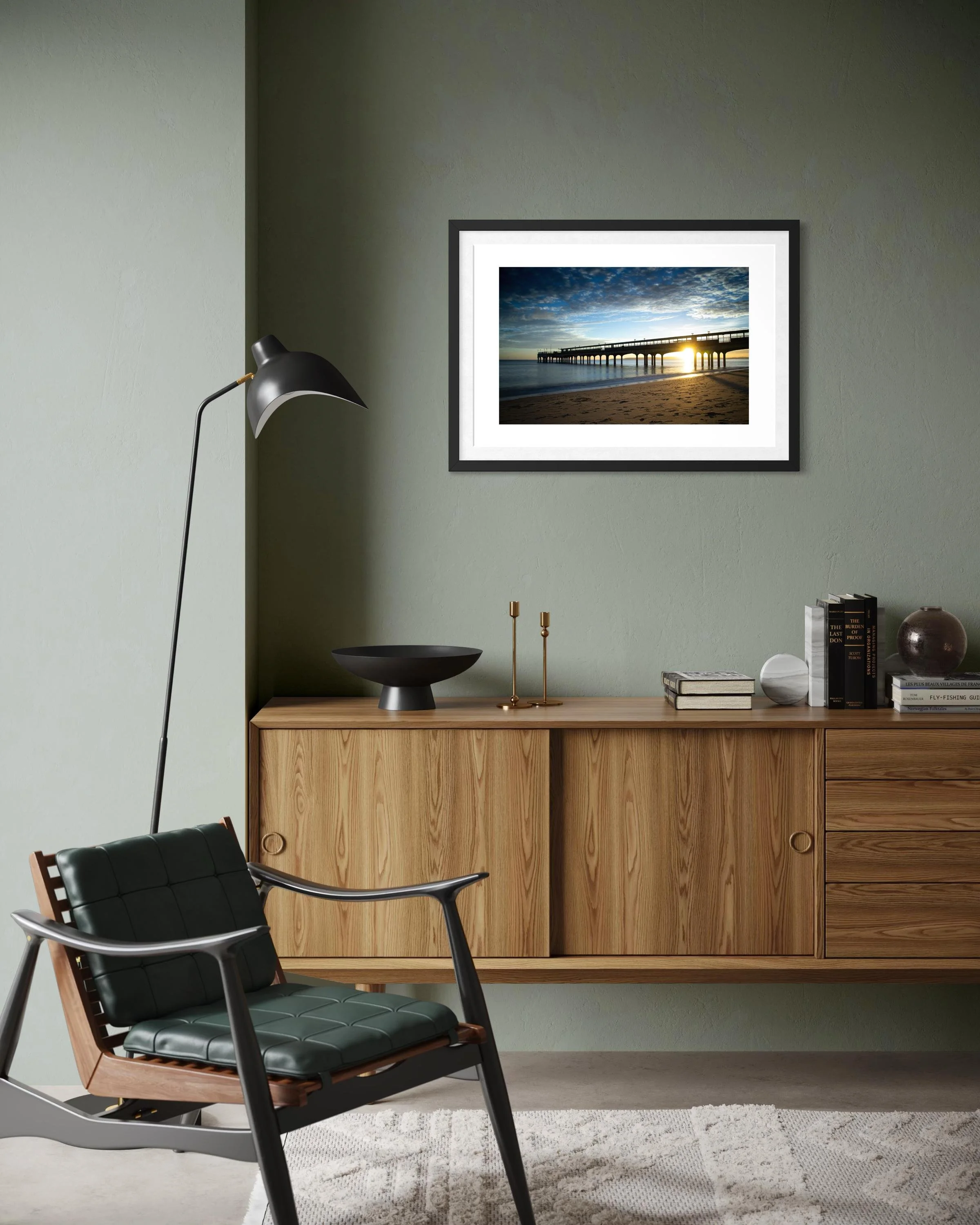 This stunning black and white print captures Boscombe Pier after a rainstorm. The reflection of the lights in the water still sitting on the boardwalk extenuates the wood giving a textural feel to the picture.